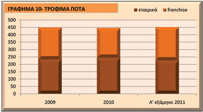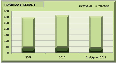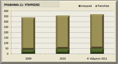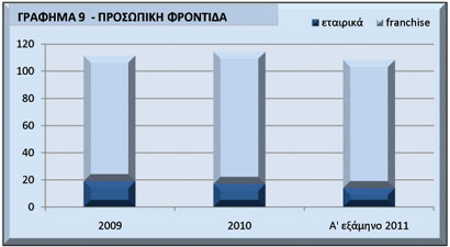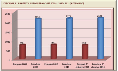 Στο συγκεκριμένο δείγμα (δεν εμπεριέχονται νέα δίκτυα για να είναι δυνατή η σύγκριση), το 2010 υπήρχε ισόρροπη ανάπτυξη εταιρικών και Franchise καταστημάτων έναντι του 2009, δηλαδή 1,1% και 1,4% αντίστοιχα, ενώ το 2011 παρατηρείται μείωση 2,2% στα εταιρικά σημεία και αύξηση 0,9% στα Franchise.