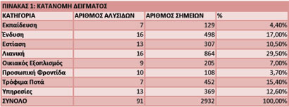 Ενώ στο συνολικό αριθμό σημείων πώλησης του δείγματος καταγράφηκε αύξηση 0,1%, τα αντίστοιχα ποσοστά ανά κατηγορία (Πίνακας 2) είναι θετικά: 1,35% στα τρόφιμα και ποτά, 5,9% στην ένδυση και την υπόδηση και3,36% στις υπηρεσίες.