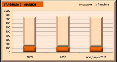 Όσον αφορά τα franchise τα αντίστοιχα ποσοστά μεταβολής ήταν –6,51% πτώση στα franchise το 2010, ενώ το 2011 στα δίκτυα του δείγματος αύξηση +11,94%!!