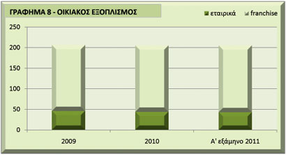 Ο χώρος παρουσιάζει σημαντική συρρίκνωση της ζήτησης από 20% έως και -25%, εντούτοις στο χώρο των δικτύων Franchise υπάρχει μια σταθερότητα. Οι αλυσίδες αναδιαρθρώνουν τα δίκτυά τους κλείνοντας εταιρικά καταστήματα που γειτνιάζουν μεταξύ τους, προσαρμοζόμενες στα επίπεδα της ζήτησης. Όμως διατηρούν τον αριθμό των Franchise μονάδων τους λόγω του ότι είναι κυρίως στην περιφέρεια, όπου διατηρούν σημαντικά μερίδια και οι Franchisees τους διαθέτουν υψηλή ρευστότητα από παλιότερες περιόδους. Όμως ο χώρος θα αντιμετωπίσει έντονες πιέσεις λόγω κυρίως από την αύξηση του μεριδίου των πολυεθνικών ομίλων (ΙΚΕΑ, Praktiker, Leroy Merlin κ.λπ) καθώς και τη διείσδυση Super Market σε κάποιες υποκατηγορίες του κλάδου. Ιδιαίτερα στο χώρο του επίπλου, υπάρχει έντονη συρρίκνωση και αναμένονται ραγδαίες εξελίξεις, ενώ στα εξειδικευμένα καταστήματα καταγράφεται ανοδικός ρυθμός ανάπτυξης π.χ. στρωματοποιία.
